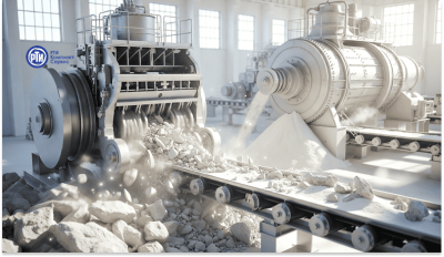 После дробления наступает стадия помола, где из щебня получают порошок требуемой тонкости. Это самая энергоемкая стадия переработки, потребляющая до пятидесяти процентов всей энергии обогатительной фабрики.